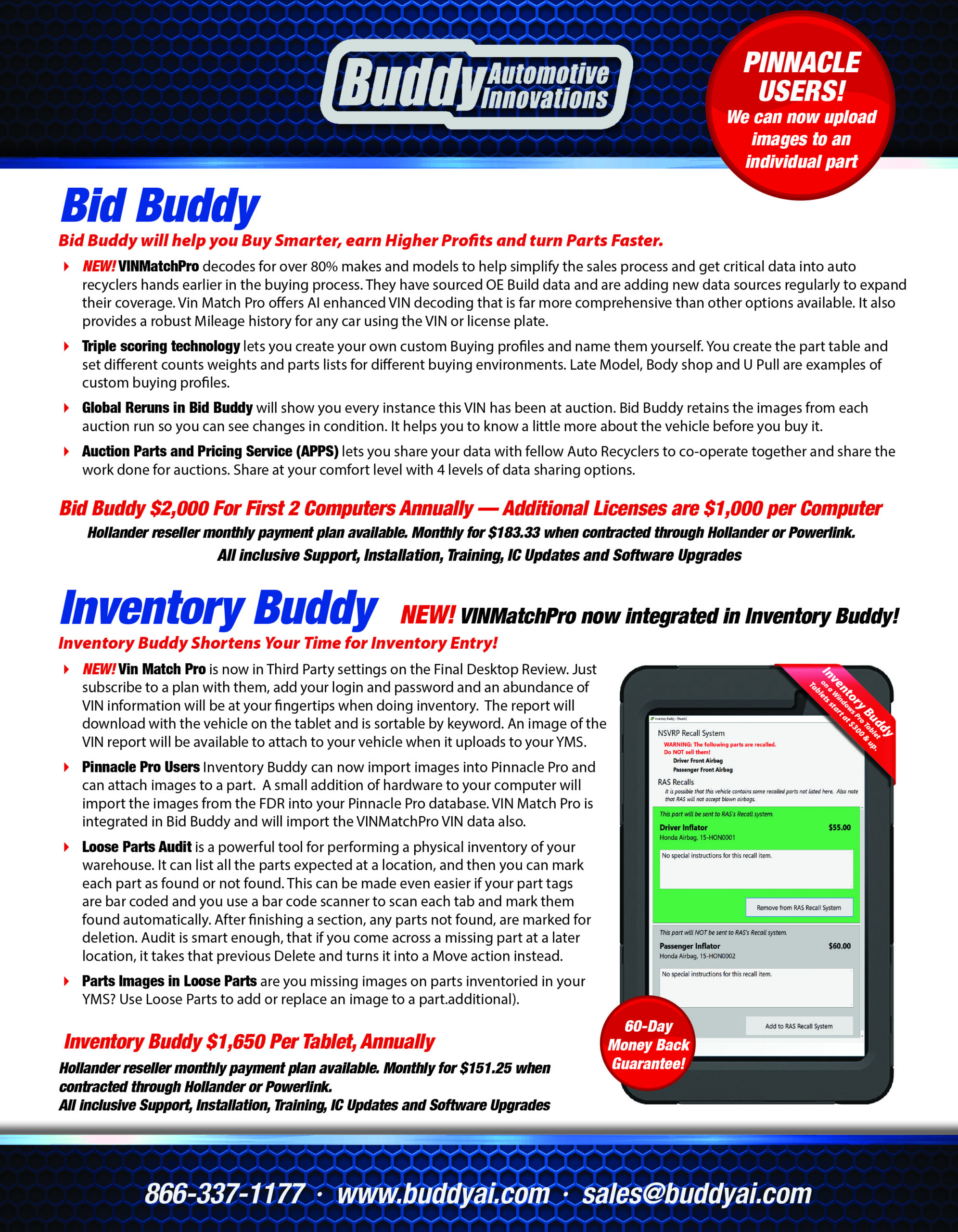 Bid Buddy is a bidding tool for online auctions and other incoming vehicles. Using Jim Counts Formulas Bid Buddy evaluates online inventory in a matter of seconds and recommends the vehicles you need most. Don’t buy vehicles that won’t compliment your existing parts inventory … make more money by buying the parts you need and turning them faster.Bid Buddy Info Sheet